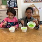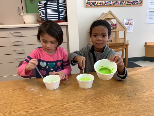 The children have shown an interest during Small Group time. We have been busy exploring science experiments as well as a lot of hands on activities. Examples include making play dough, moon sand as well as slime. We have been working on what it means to be a scientist, as we have been experimenting with baking soda and vinegar. The children have been encouraged to make a hypothesis or educated guess. Some children thought that the two ingredients would bubble up and others thought that it would change colors as we added liquid watercolor to the mixture.