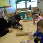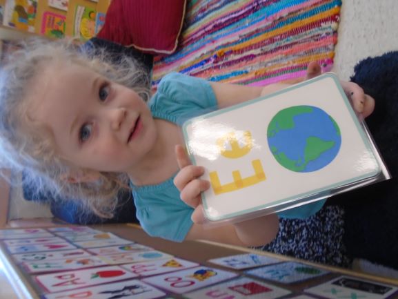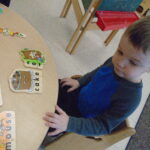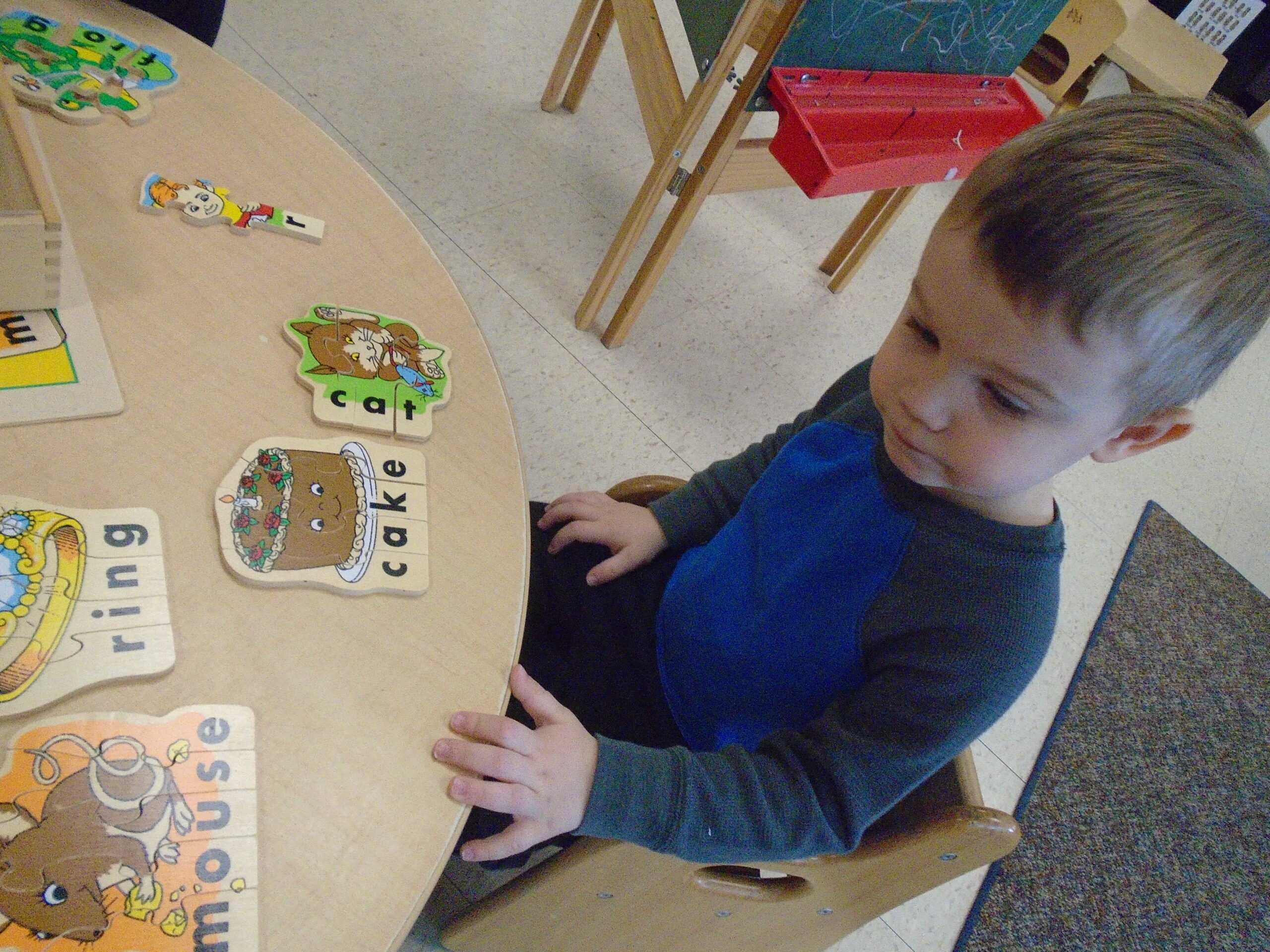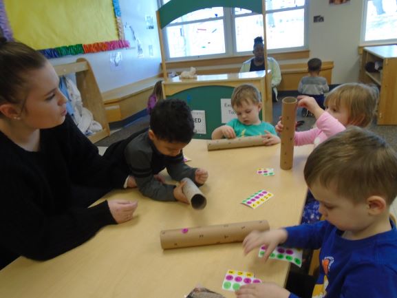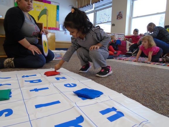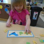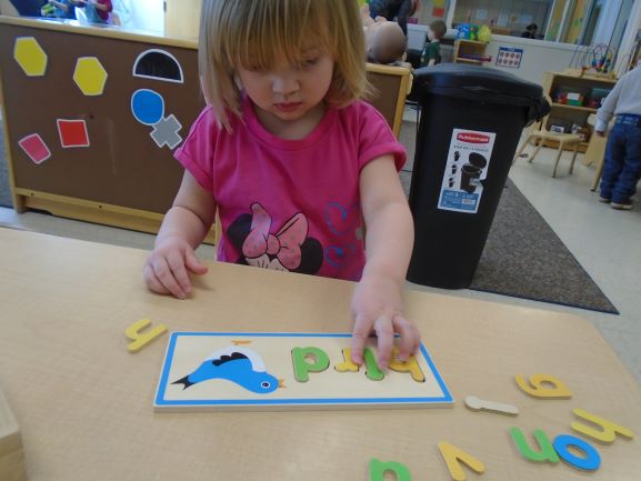 This month the children have shown an increasing interest in letters. In the classroom, we have added letters to the library area in order to accommodate this interest. We have also brought in two different letter puzzles on multiple occasions that the children have enjoyed. One of the puzzles has the picture directly above the letters that make up the word and the pieces are the individual letters with a piece of the picture. With this puzzle, the children were able to use the picture to piece together the letters of the word. The other had letters for puzzle pieces with a picture on each board as a reference. We also had a few teacher directed activities focusing on letters as well. During one group time, the children each had a turn flicking a spinner to find a letter and then placing a bean bag over that letter on a mat. Allie, one of our interns this semester, also implemented a small group activity where the children matched the letters on the stickers to the letters drawn on a paper towel roll. We worked on having the children repeat the letters when they find their fit in these activities and the next step will be identifying some letters from their names.