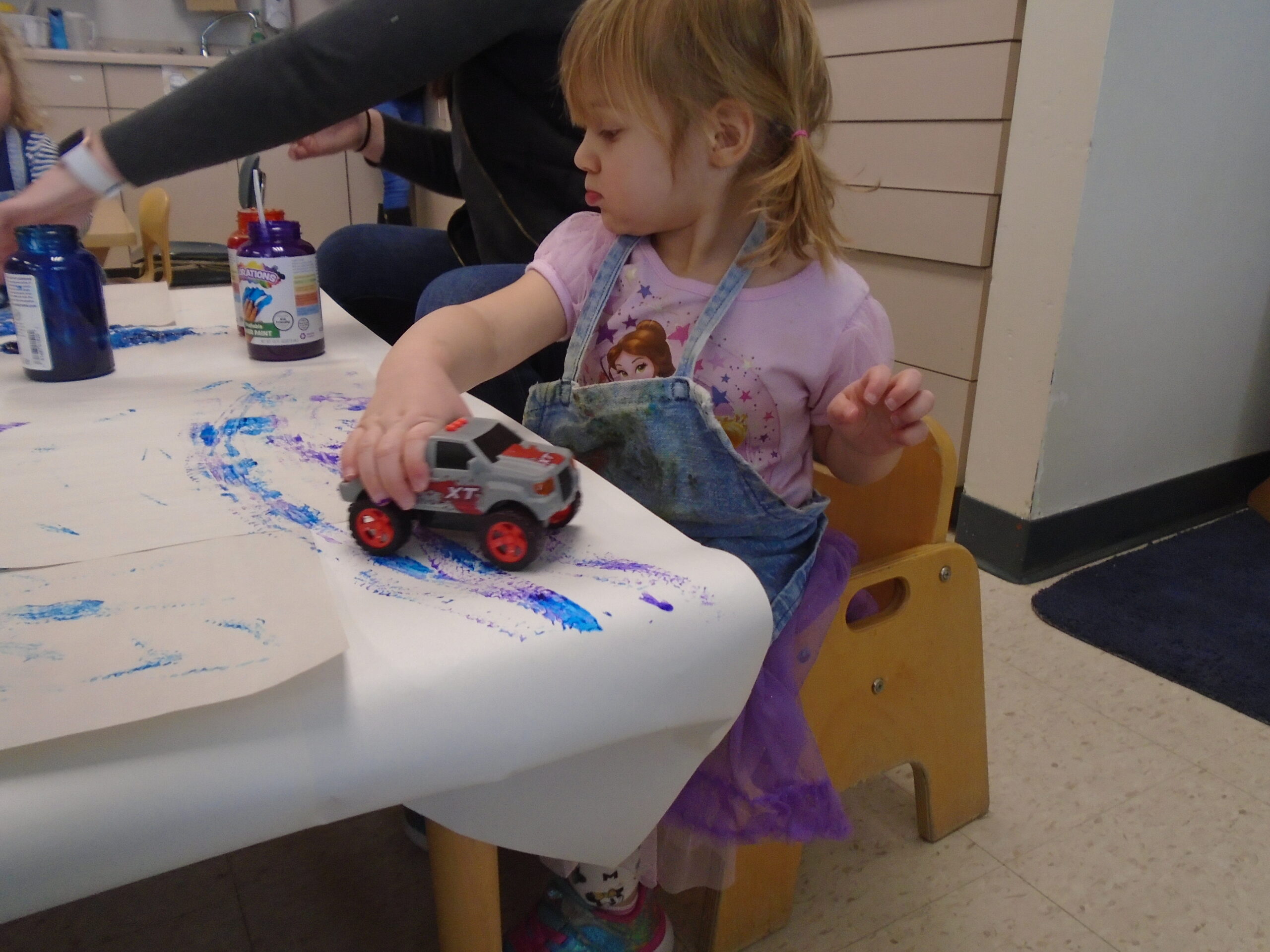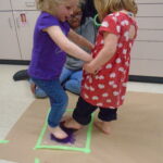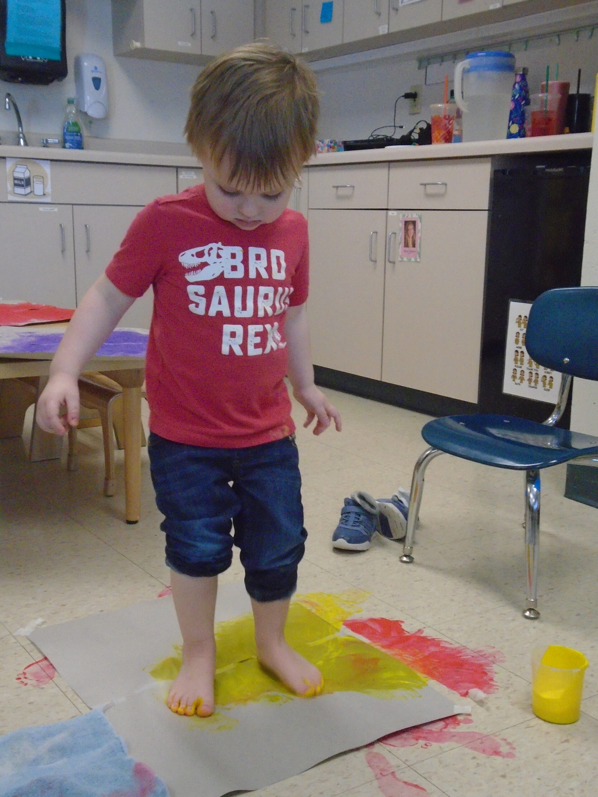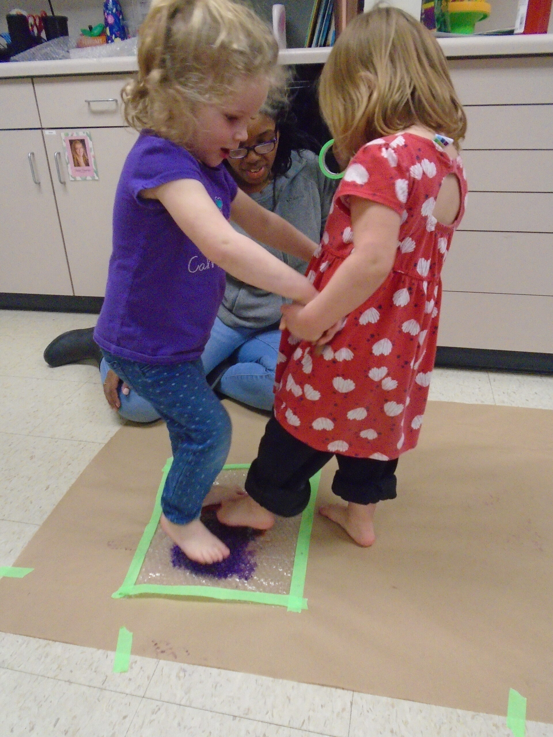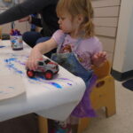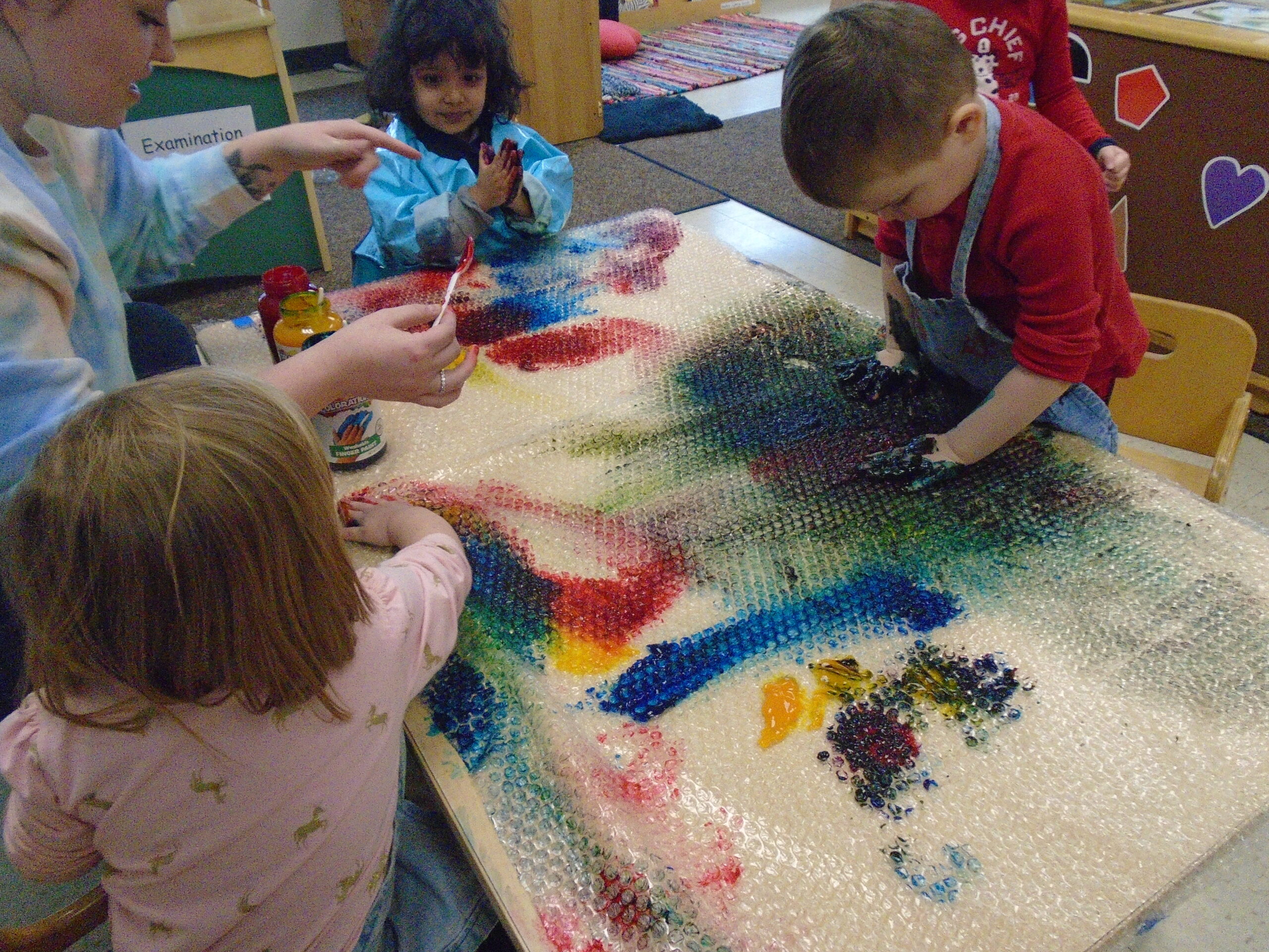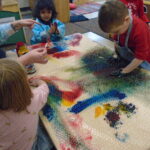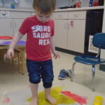 We have also been doing a lot of art with sensory activities that includes toy cars, paint, bubble wrap, hands and even their feet. Painting can be one of the many ways the children are able to express themselves. One of the teachers did a small group with bubble wrap and paint. She taped down some bubble wrap on the big table and had the children smear the paint with their hands and trying to pop the bubbles. On two different occasions, the children were able to paint with their feet. One had bubble wrap with paint underneath and the children were able to jump up and down on it. The other, there was taped paper onto the floor and their feet were dipped into some paint. The teacher then put music on and had the children dance around the paper, making foot prints and smearing the paint around.They also got to paint with some toy cars, there was bubble wrap taped on a table with some paint and the children got to drive their cars around. Smearing the painting around watching the car leave “tire tracks” on the wrap. All these different things include some kind of sensory whether it was with their hands or feet. The children always enjoy some messy paint.