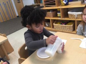 We have been working on the skills to help us take care of some of our own classroom needs. We are mastering the “flip trick” to put our coats on independently and we continue to use our handwashing song to make sure our hands are cleaned properly. We also have learned to serve our own food and pour our own milk during our daily “family style” snacks and meals. We are learning how to “use our words” and take turns and share. With the help of several books, such as Hands are Not for Hitting and Sharing Time, and of course modeling from the adults in the classroom, we are learning successful techniques to express our wants and needs appropriately. Teaching independence is a goal that we are taking very seriously as we are preparing these children for preschool. I recently read an article that explained that there are 12 things that your 2 to 3-year-old can be practicing, both at school and at home, that can help foster independence and self-esteem. These include:
