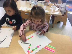 The children are showing interest in math and science activities. In math, we have been counting to 10 and beyond as we provide many math manipulatives and table toy games. We have been learning about and matching shapes as we sing shape songs and discover that shapes are everywhere in our environment. We have been on shape hunts and have made a variety of shape posters. Puzzles have been an interest this month as our children have discovered that through trial and error and some scaffolding from teachers, they can successfully complete any age appropriate puzzle put before them. They are so proud of this accomplishment! Our scientific thinking had us learning about chemical reactions and changes in matter. We did experiments which included Magic Milk, erupting liquids, using baking soda and vinegar; and exploding soap using Ivory soap bars.