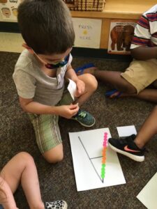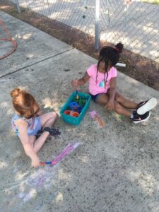 Literacy was explored through books about friendship and fairy tales. Journals were given to each child for writing and coloring activities. Building those hand muscles are important for our friends heading to kindergarten in the fall as well as for our beginning writers. We are practicing writing our name using both uppercase and lowercase letters. The children enjoyed our group time games called “Doggy, Doggy, Where’s Your Bone?” and “Bug in a Rug” which taught us rhyming word phrases and how to take turns with our friends.