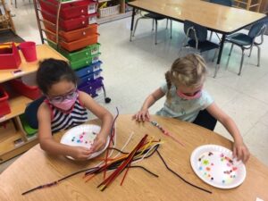 Fine motor development had us placing dot stickers on our first initials. We made individual balls of playdough for each child to control and manipulate. “Squishy bags” were created using zipper bags, cornstarch, water, and food coloring. We also strung beads onto string and pipe cleaners to make necklaces and bracelets.