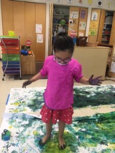 Creative expression had us painting on small pieces of tin foil using Q-tips as our paint brushes. We laid out huge pieces of construction paper on our classroom floor, stepped in paint and painted with our feet. Using a large piece of paper canvas and rollers we mixed primary colors. The children were amazed when secondary colors started to appear. We brought art outdoors and made liquid chalk and painted murals on the sidewalk.