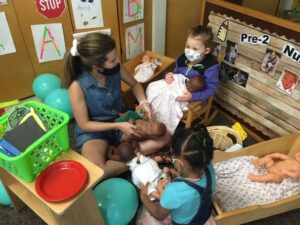Social studies had us studying babies as we turned our dramatic play center into the “Pre-2 Nursery.” We shared baby pictures of ourselves and talked about how much we have grown and changed from our baby days. During group time the children enjoyed the “Little Cat” rhyme and used their elimination skills to find out which hat the cat was hiding under. This game had us talking about the jobs of community helpers, such as fire fighters, nurses, construction workers, doctors, etc.