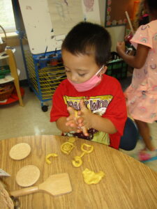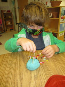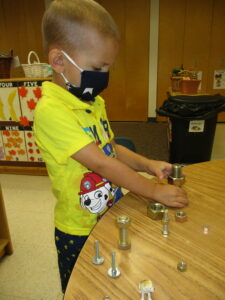 Fine motor has been on the forefront this month, as we have done several activities and offered play experiences that can help strengthen and improve fine motor skills in the children. Practicing these skills will help with writing, drawing, buttoning, and eating. These are just a few tasks that improve with fine motor exercises. Some of the activities we have done to support these skills include putting coins into a bank slot, stringing beads, using the write board and dry eraser markers, stencil art, using a pipette in science experiments, sticker play, exploration with Play-Doh, exploring with nuts & bolts and lacing cards. We will continue to offer fine motor activities for months to come.