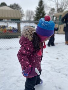 Our read alouds have all pertained to cold concepts. We read, “There was a Cold Lady that Swallowed Some Snow.” This story is about a silly lady who swallows various items like coal, snow, a scarf, and sticks. Towards the end of the story, she had a large hiccup and out popped a snowman! The children enjoyed the sequencing and recalling which items came next in the story. This was a great review for our rhyming words. We provided visuals of each item in the story so the children could retell the story during choice time, and they did! In terms of literacy development, we introduced the children to the concept of compound words. All the compound words we initially discussed began with the word snow. For example, we used the words snowman, snow-cone, snow-fort, and snowflake. To encourage word combining visually, we would use each hand for each word and then clap the whole word. This helped the children break up each word and then bring them together. With repeated practice, they caught on to this concept quite quickly.