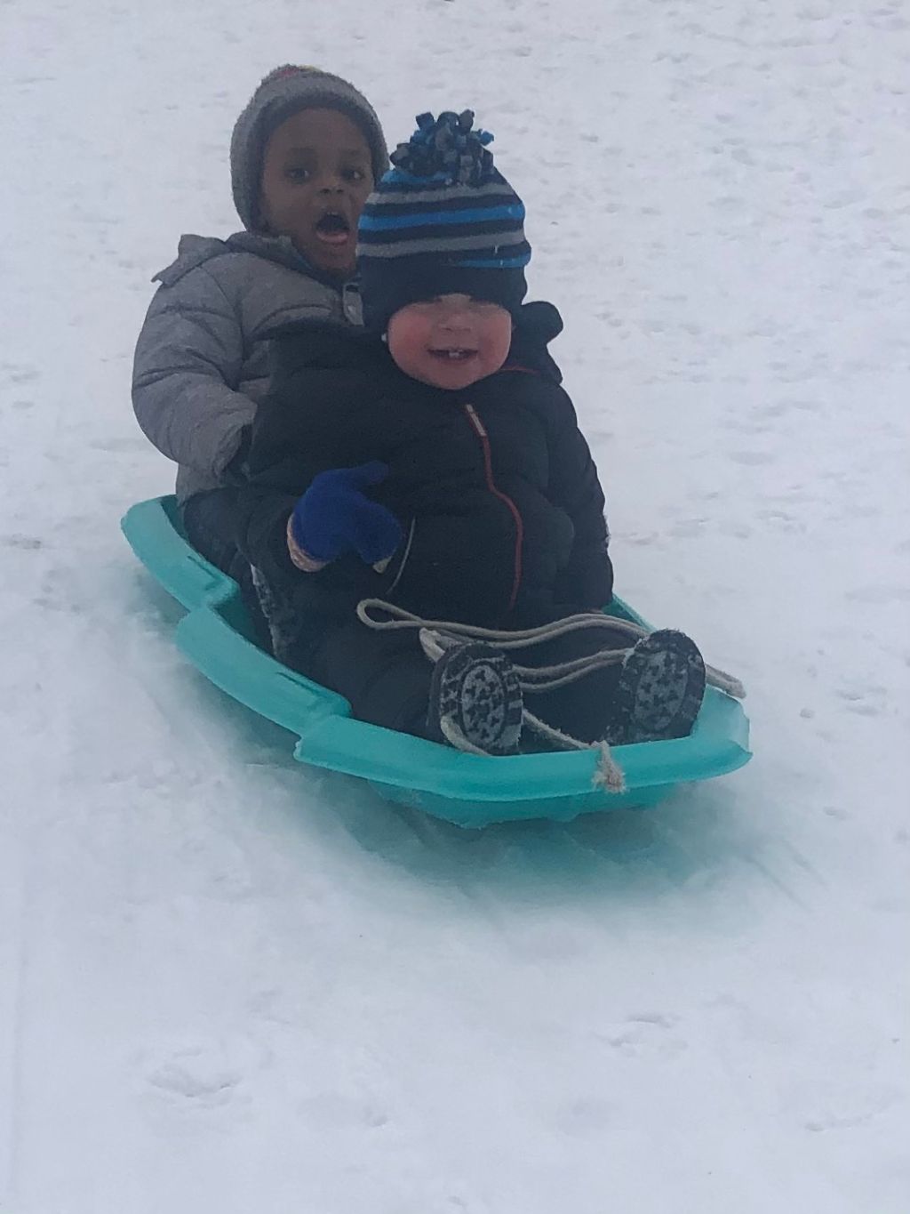 snow pants, boots and coats. The children are learning to walk in all the snow gear, they are learning that if they take off the gloves their hands get cold! Sledding down the little hill outside our playground has been a highlight! We have some thrill seekers in our group!