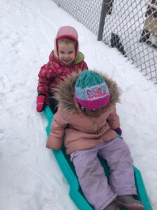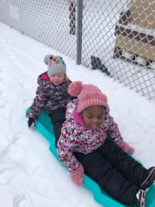 Outside time has been an engaging time for our children. They have been very engrossed in the snow and what it looks and feels like. One of the things we have been able to use is a sled. The children have been learning about turn taking when we switch so can have other children take a ride. The children also have been interested in touching ice that is within reach. Just a reminder that our outside times and locations are the following: 10:45-11:45 a. m. at the CDFC playground and 3:45-4:15 p. m. at the Gabel Hall playground. Because we are