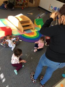 Tori brought a large bridge that converts into a boat into our classroom when we weren’t able to go outside due to cold weather. The children have been using their gross motor skills to climb and crawl on the bridge, while also learning how to move their bodies to safely get off the bridge.