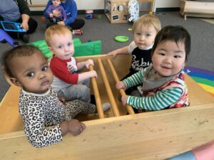 In the past, children have sat on the rocking chair and a teacher will rock the chair back and forth and sing, ‘Row, Row, Row, Your Boat’ to the children. Now that we have a boat in the classroom, this has been been utilized more than the rocking chair. Some of the children have learned the motion and how to rock the boat back and forth. While in the boat, they are moving their body forwards and backwards making a slight rocking of the boat.