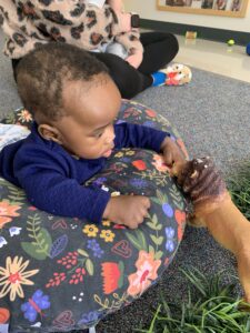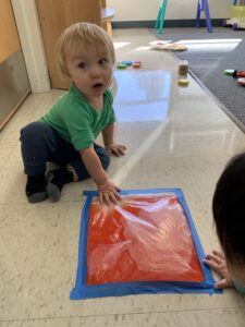 Singing songs, doing finger plays, making animal sounds, and playing with bubbles have been a favorite throughout our first month back at school. We’ve been singing about farm animals, roaring like tigers and lions, watching bubbles float to the ground and then pop them with our fingers. The infants have also been doing some art with paint and a lot of sensory activities.