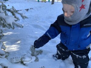 In the mornings we walk over to Gabel’s infant/toddler playground, while in the afternoon, we use the main CDFC infant/toddler playground. The children have been taken on sled rides, they’ve explored the snow and ice through their sense of touch and taste, and have been working on climbing up and down the climber to use the slide, with teacher guidance.