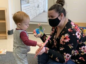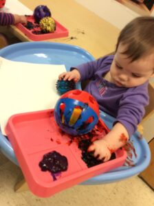 Singing songs, doing finger plays, making animal sounds, and playing with bubbles have been a favorite throughout our first month back at school. We’ve been singing about farm animals, roaring like tigers and lions, watching bubbles float to the ground and then pop them with our fingers. The infants have also been doing some art with paint and a lot of sensory activities.