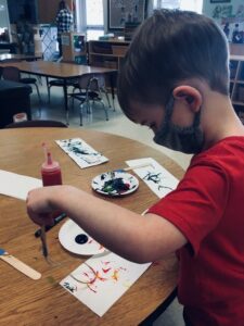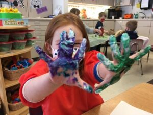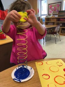We have been exploring paint while using a variety of tools. We used our hands to finger paint. We dipped slinkies into paint and bounced them onto paper. String painting, using the primary colors, allowed us to mix colors to make new colors. Painting allows children to express themselves as well as promoting their printing and early writing skills.