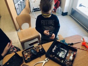 We created a “Tinkering” station in the classroom and found it to provide many benefits to the children. Taking apart small appliances, such as clock radios and DVD players, and finding out the many small parts that must work together to make the machines work, provided excitement and curiosity. Tinkering boosts confidence and competence. In addition, it allows for heightened creativity, longer attention spans, stronger problem-solving skills, and an increased ability to persists through frustration.