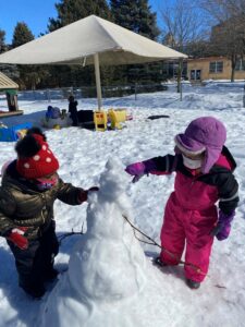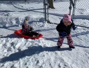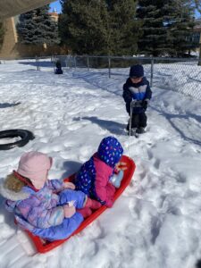 We seem to have turned a corner this week weather-wise. This week felt like a heat wave as the children and teachers took time to appreciate the outdoors every day this week. There was still snow on the ground to provide the children with some sensory experience while getting reacquainted with the great outdoors! Some children have attempted to ride the cars on the playground only to find that they are stuck in the snow. This sparked a conversation about the sun and why we need warm weather (so we can move our playground equipment of course!). The children added some minor details to a snowman that was already made. Every time there is snow on the ground, the children take turns pulling each other on the sleds. We will be going outside as long as the “Real Feel” temp is above 15 degrees. Please make sure your child has all their winter gear at school daily