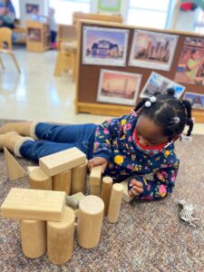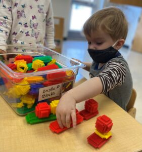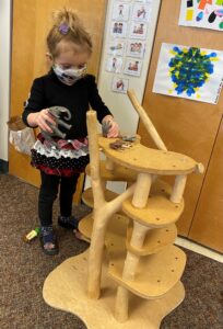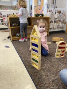 Spending time indoors the past month when it was too cold to go outside has given the children the opportunity to spend longer periods of time using the classroom manipulatives and blocks. The children are beginning to create and label various structures using wood blocks and the Duplos. Sometimes they use props such as trees, animals, cars and people with the blocks. Sometimes they choose to just create towers and other random structures. Both of these experiences provide a creative outlet while exercising spatial awareness and fine motor skills.