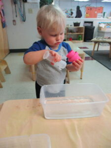 March will bring us many changes in the weather and with the children. Our focus for March will be self-help skills and independent thinking so we will be encouraging the children to take off and put on shoes. They will be hanging up outside clothing in their cubbies, washing hands independently as well as pushing in chairs and of course putting away material. They will also be helping in the classroom with appropriate tasks like helping to set up activities, and cleaning table with soap and water. The children are also becoming interested in group games; like spotlight dancing to a song called In The Middle and a Bug in the Rug guessing game.