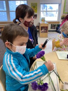 read some stories about flowers and plants including The Tiny Seed by Eric Carle and Planting the Rainbow by Lois Ehlert. We had the opportunity to investigate sunflowers and carnations with our senses and magnifying glasses. We even had set up our dramatic play center as a flower shop! We have had flowers, different shovels, seed packages, watering cans, etc. This was inspired by our experiment of planting sunflowers.