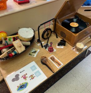 The children showed great interest in the music area of the classroom. We have a record player and the children are able to independently play records by moving the needle onto the record, they also enjoy turning the volume up and down. We also have a variety of instruments from different countries. The children enjoy exploring each unique instrument, learning how to play it appropriately, and creating music with their peers.