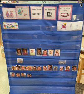 After our first clean up time, we transition to morning meeting or group time. Everyday we sing the song, “Do you know this friend of mine?” This helps the children identify their peers by face and name. We ask if that child is at home or school. We review the group time rules which include looking with your eyes, listening with ears, gentle hands and feet, sit on your bottom, quiet voice. We review the daily schedule with visuals and ask the children what comes next. This is a great way to assess their recall and recognition. We have just introduced problem solving cards, these are visuals that help the children come up with solutions to social problems that may arise in the classroom.