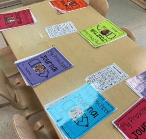 The children have been signing in when coming to school each day. Each child has a journal and they are encouraged to sign their name or draw a picture. Alphabet cards and name cards are used as a reference when referring to specific letters in their names. This task will show progression throughout the semester with letter recognition, fine motor skills and writing skills.