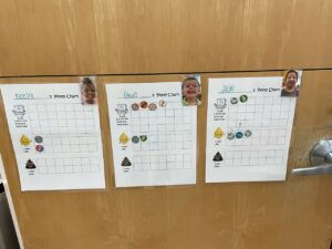 Some Pre 2 children are in the process of potty training, we have made sticker charts to encourage them to use the toilet. Since doing this we have observed peers and teachers excited for their classmates to use the potty. This visual helps the children see their accomplishments over a period of time.