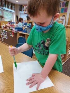 For the children’s fine motor skills we have been using pipettes, scissors, tongs, a variety of pens & other drawing tools, stringing beads, and a wide variety of manipulatives such as peg boards, stacking tables, and Lego’s.