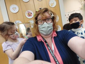 Fine motor happens in so many areas of our room! This photo shows the children using their fine motor skills on my hair. They have to use a pincer grasp to open and close hair clips and bows to put them in my hair.