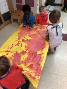 activities allows the children to become comfortable with sensory and creative exploration. For example, a child who dislikes to get his hands in the paint finally (with encouragement) got both hands in the finger paint!