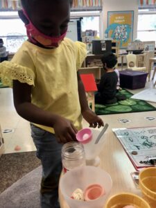 Our dramatic play area has been transformed into an ice cream shop. Within our ice cream shop we have several familiar items, such as scoops, sprinkles, cones, cups, and toppings. To encourage building math concepts, the teachers have been modeling how to take an ice cream order. For example, we ask how many scoops, cherries, or toppings, then write the number on the order form. The children then go and create the recipe using the above listed items and count out scoops.