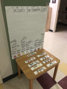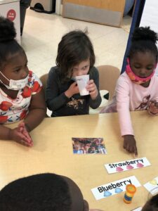 To expand on the children’s prior knowledge of ice cream flavors, we experimented using our sense of smell. Using various flavor oils on a cotton ball, we labeled each flavor in a cup. Using visuals and print concepts, the children guessed and matched each smell with the printed word. For example, we showed the children the printed word chocolate and then allowed each child to smell the chocolate flavoring. Each child voted on their favorite flavor. The most popular choice was lemon. Parents and families also got involved smelling and choosing their favorite flavor.