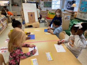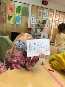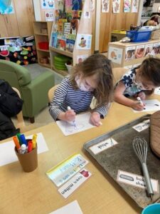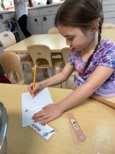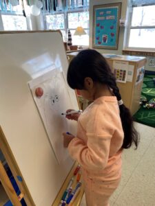 The children have been spending time working on their emergent writing skills in the classroom. In the past few weeks have planned activities that included observational drawings and writing. The children are getting more confident in not only writing their names but other words as well.  During free play, the children have been picking up the various writing tools (crayons, markers, dry erase markers etc.) and writing independently or with a friend at our writing center. These activities and “practice” build the fine-motor skills needed for more advanced writing. Be sure to check out our emergent writing display in our hallway.