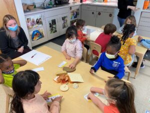 We are into our 2nd week of The Creative Curriculum Bread Study. We have been reading fiction and non-fiction books about bread to give children a knowledge base on the study. Our dramatic play area has been changed to a farmers market to help support the study. We have included a variety of multicultural “bread” into this center. We used breads in our small group math activities as we sorted, counted and made graphs from collected “data.” We showed and discussed kitchen tools with the children and then they practiced writing word-wall words about kitchen tools and they even drew some kitchen tools. Later on this week we plan on learning a new play-rhyme called “Peanut Butter and Jelly” before sampling some sun butter and jelly sandwiches as a group. The teachers will also be learning WITH the children at the end of the week as the teachers and children learn about making bread from scratch using a real bread machine! Stay tuned for the bread reviews.