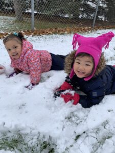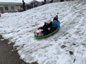 We experienced the first snowfall this month and children were able to play on the big playground for the first time with snow. A handful of children loved sledding down the big hill. They used teamwork to get the sled back up the hill by each holding an end of the sled to go back to the top to slide down.