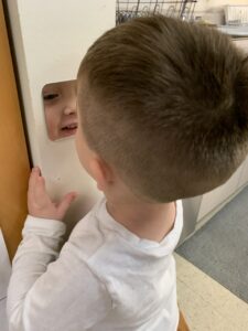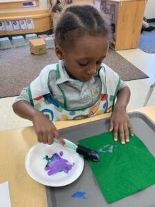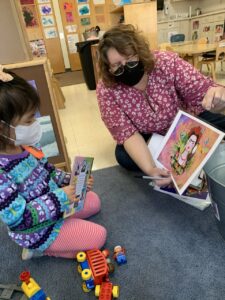 Reading has always been a huge interest for our classroom. We have begun introducing rhyming books to the children. They seem to really enjoy, I Ain’t Gonna Paint No More. In this particular book, a little boy is found painting the walls, floor, ceiling, everything in the house he shouldn’t be. His mom puts the paint away, but he finds a way to get it back. The book gives statements that end with a rhyme of a body part that the little boy ends up painting. The children in our classroom have been able to rhyme the body part, with the help of visuals from the book as well.