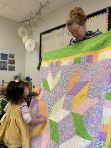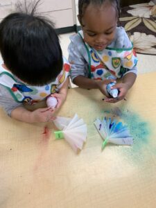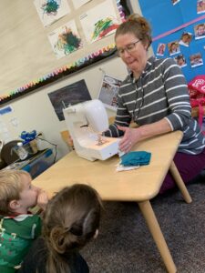 During our last week of the month we looked into the different cultures and languages in our classroom. We listened to music in Spanish, Korean, and Mandarin that were some common songs that the children could recognize by the tune, and some new songs that are unfamiliar! While looking at artwork of Frida Kahlo, ceramics, fans, and paintings, we had conversation with the children about what they saw in each piece of artwork. We made our own artwork to resemble other cultures using various techniques or colors. Sherie, a practicum Master Teacher, brought in some quilts that she has made and her sewing machine to show us how quilts are made. The children all had the opportunity help her sew some fabric together by pushing down on the pedal to make the needle bob up and down.