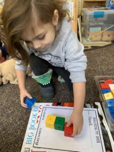 We encouraged the children’s participation through graphing characteristics of ourselves. We made separate graphs for eye color, hair color, family structure, and who had pets at home and who didn’t. For graphing our eye and hair color, we provided the children with mirrors to observe themselves. We also took pictures of them to be able to show them and zoom in on these features for the children to classify. When discussing our families, we read a book about families and what a family can consist of. Some families have siblings, some have two moms or dads, some have one parent, etc. In addition to tallying how many of each our children had, we added a spot for ‘Baby on the Way’ as we have two children in our classroom that will soon be promoted to ‘Big Sister!’ We also documented and measured how big some children’s feet were. We traced their shoe and and they then used about 1.5 inch cubes to see how many cubes big their foot was.