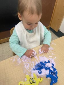 February activities included painting, painting and more painting!  The children painted with cars, on foil and a variety of types of tools to paint with.  Sensory activities included Snow, Water, and Foam.  New material in the classroom has captured the children’s interests.  The school buses, animals, soft blocks, the new foods and the bigger dolls.  This classroom loves their books and when they notice new books on the shelf we have to read the book two or three times before moving on to the next book. The children loved it!  This attention to the books certainly ignited a love for our library!