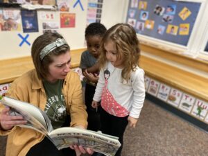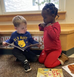When we think of HOW to promote language development in children at this age, we think of books. Children may be ready for longer books with more complex plots. They will benefit from books with varied vocabulary words and stories that will facilitate more conversations. We have noticed that the children have been sitting for longer periods of time. We have been able to ask them simple questions during our reading experiences and we will continue to adapt our conversations as they demonstrate more comprehension around stories.