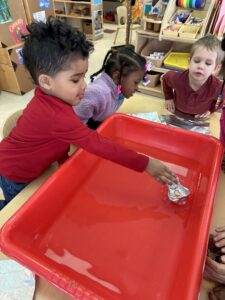We discussed concepts of sink or float by using small items from around the classroom. During small group, each child made a guess and then tested their items. Items ranged from feathers, pinecones, marbles, to a paper clip.